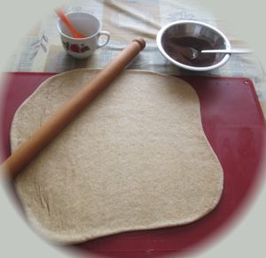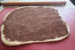 30 percet kelesztjük, majd kisodorjuk körülbelül 1-2 cm vastagra, meg kenjük kevés olvasztott vajjal és megszórjuk xilittel elkevert kakaóporral.