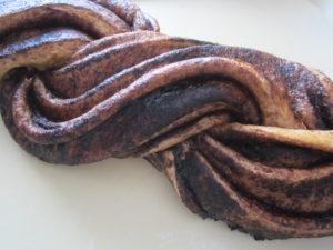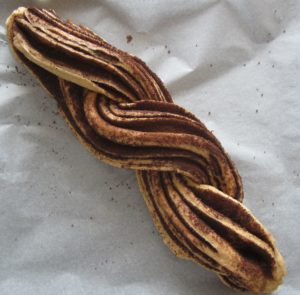 Feltekerjük, hosszában ketté vágjuk és „összefonjuk” és további 30 percet kelesztjük. Ezalatt előmelegítjük a sütőt 170 fokra (alul-felülsütés). Sütés előtt tojással le kenjük és 30-35 perc alatt készre sütjük.